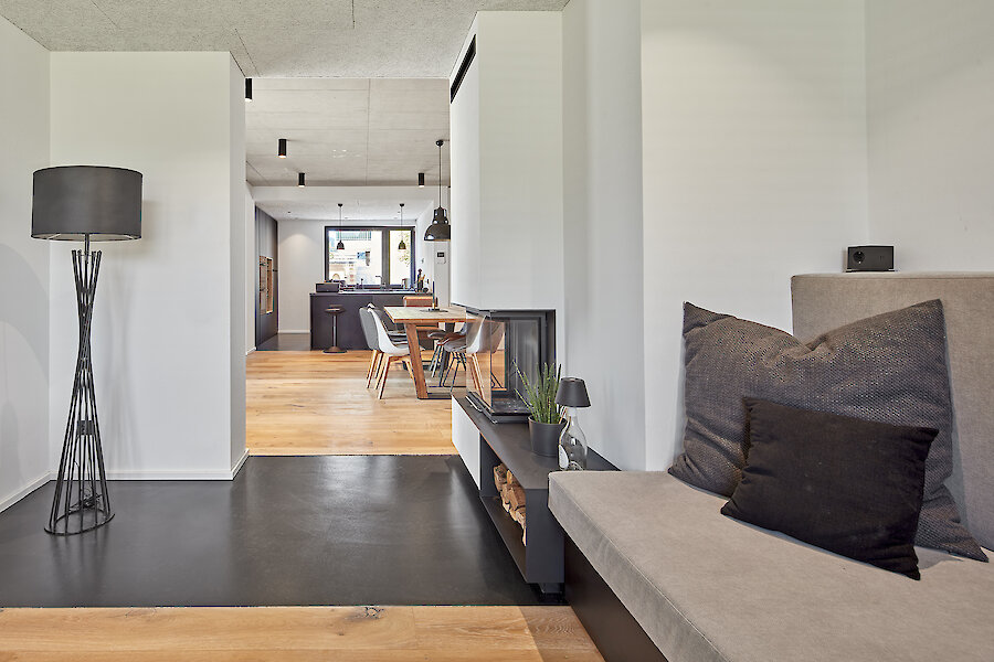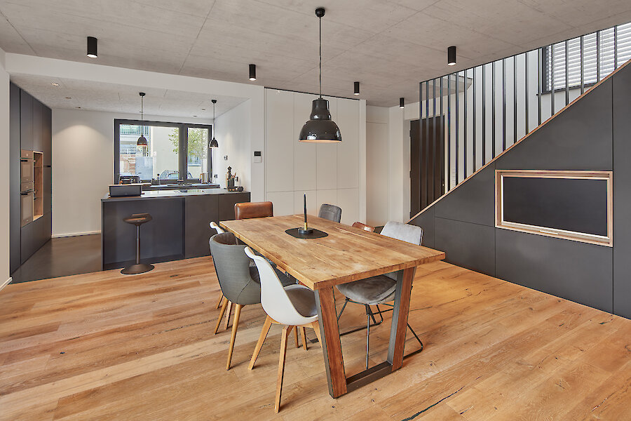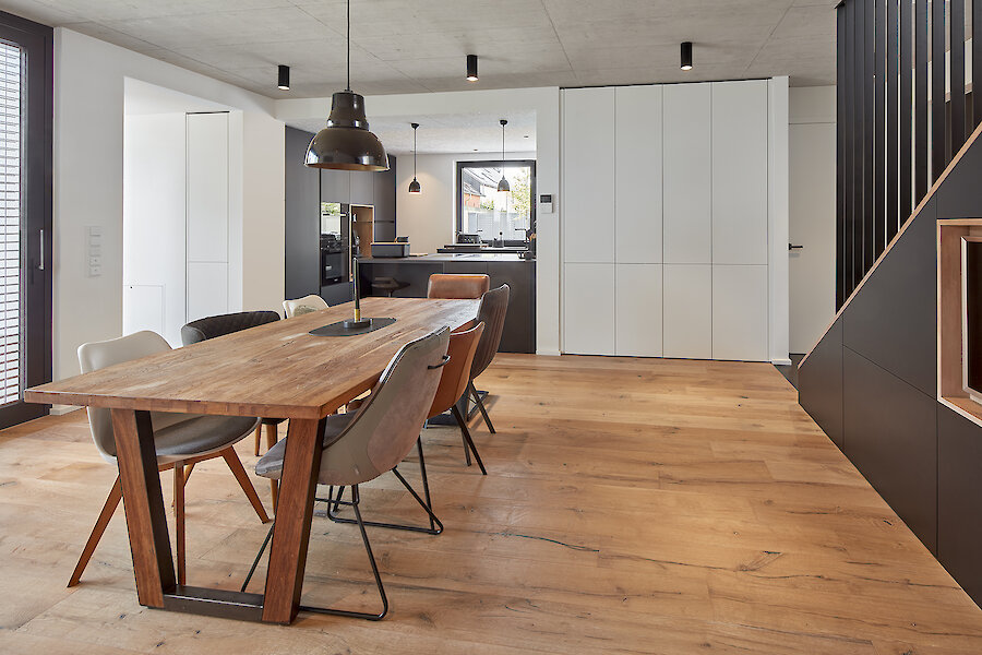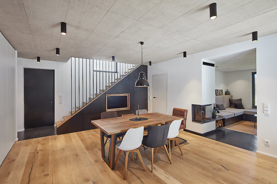 Der „Herzraum“ im Erdgeschoss ist Dreh- und Angelpunkt. Hier steht der große Esstisch, hier ist das große Fensterelement zum Garten. Die Treppe steht als Gestaltungselement im Raum, und die Feuerstelle verleiht Atmosphäre und Wärme. Küche und Wohnzimmer, beide relativ klein, sind seitlich angedockt. Flure gibt es kaum.
