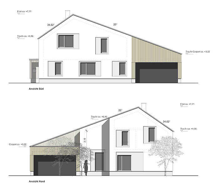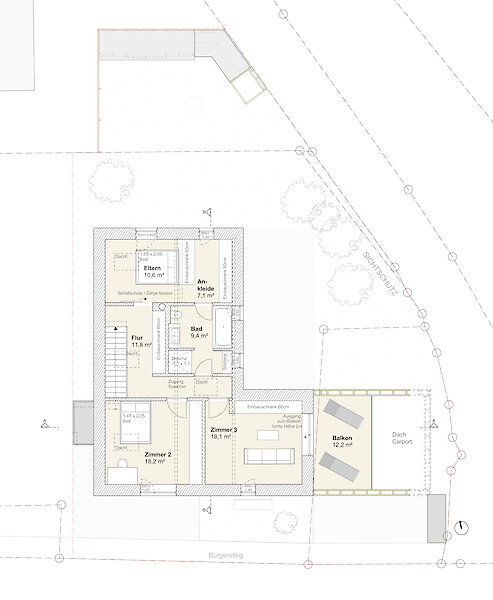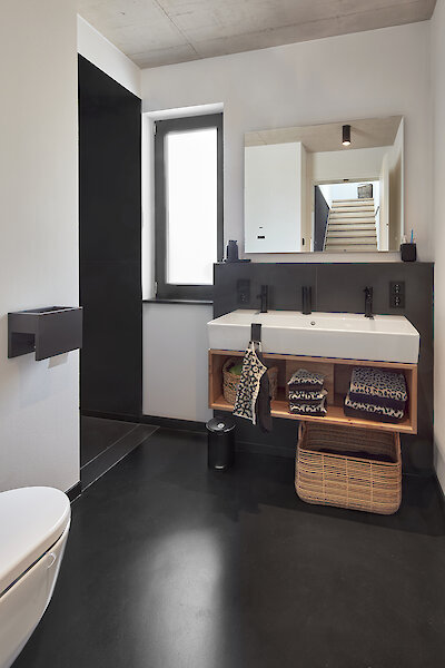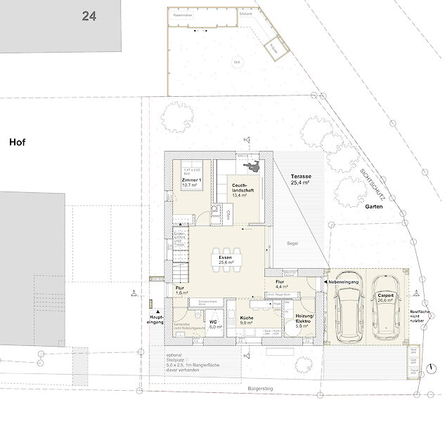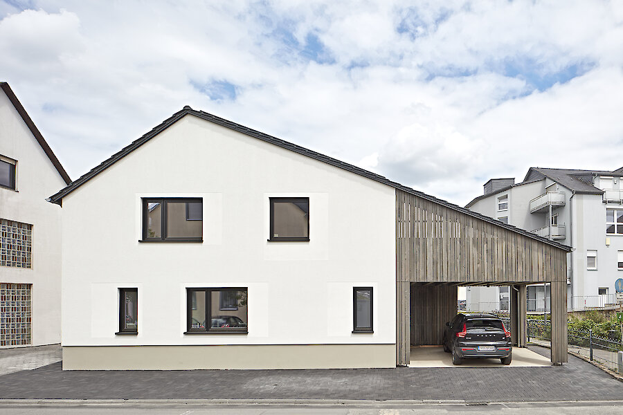 Die örtlichen Begebenheiten ergaben einen L-förmiger Grundriss; ein Carport verlängert das Haus optisch in Richtung der Brücke. Dadurch entstand zugleich eine geschützte Terrasse zum Bach. Die Holzelemente des Carports wiederholen sich im gegenüberliegenden Eingangspavillon und dem Gartenhäuschen. Dezente Putzfaschen um die Fenster herum sind ein Zitat der traditionellen Sandsteingewände der alten Häuser in der Nachbarschaft.