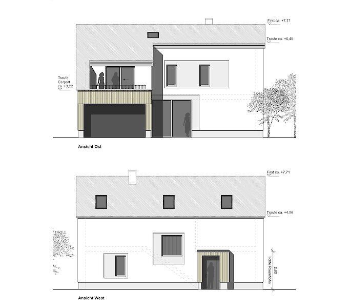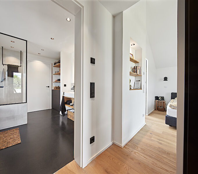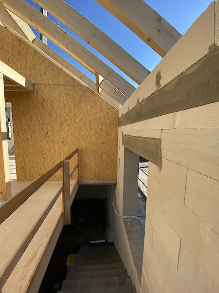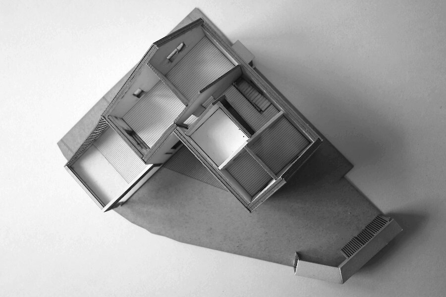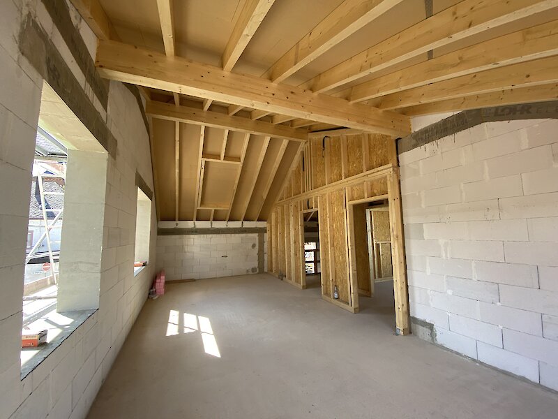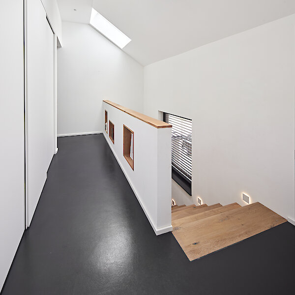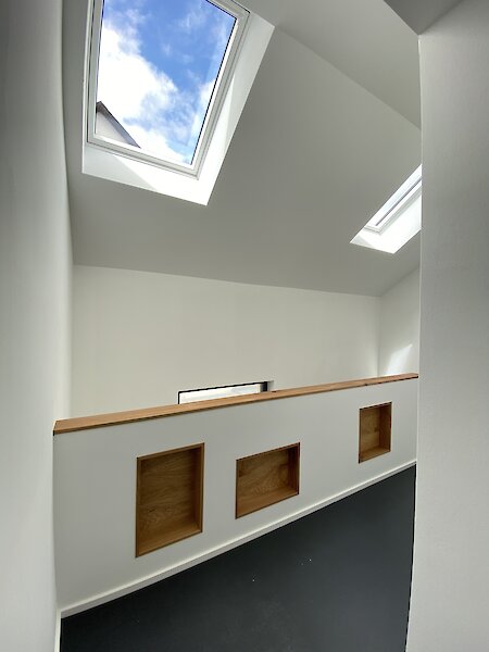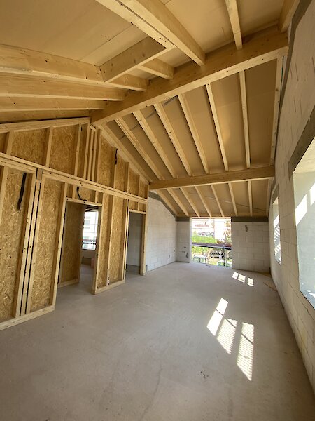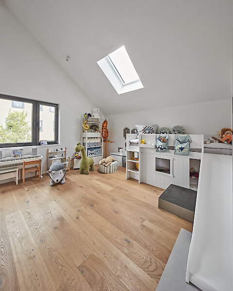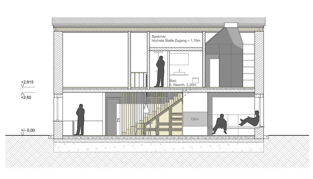 Im Obergeschoss ist der Dachraum bis unter den First offen, so dass in der Mitte der Räume eine Höhe von über 4,00 m besteht. Das verleiht den Räumen Großzügigkeit; so konnte der gesamte Baukörper im Volumen stark verkleinert werden, was den Kosten und der Proportion stark zugutekommt.