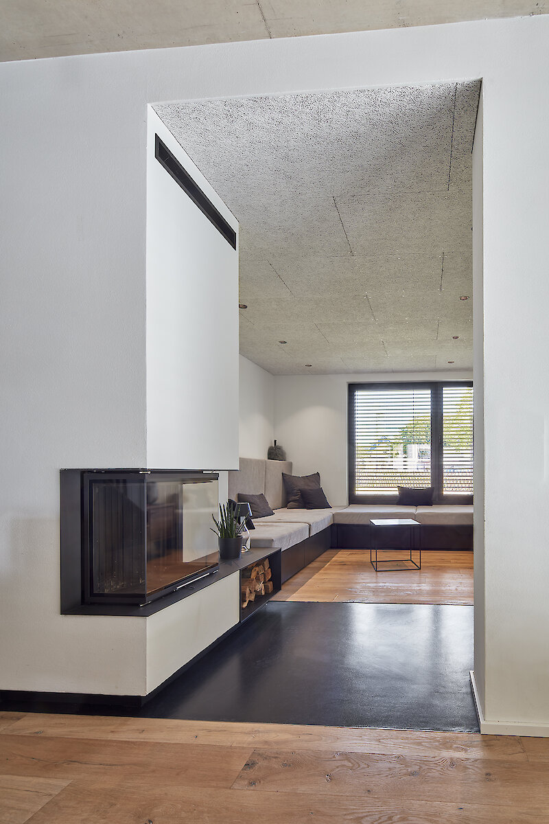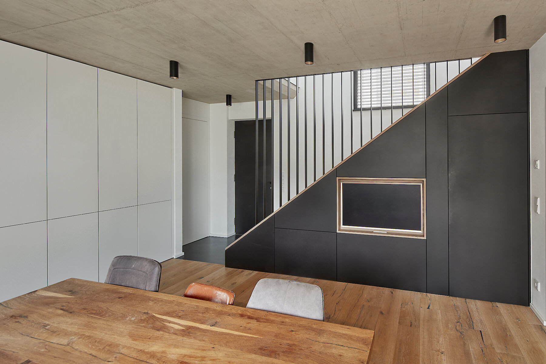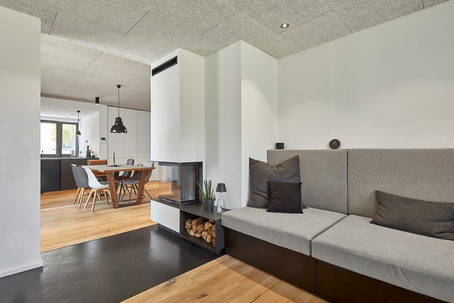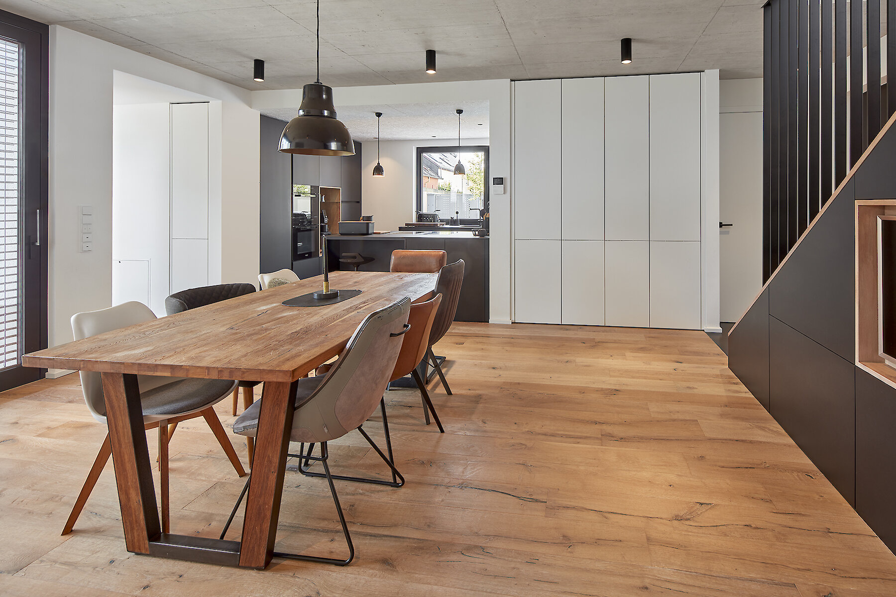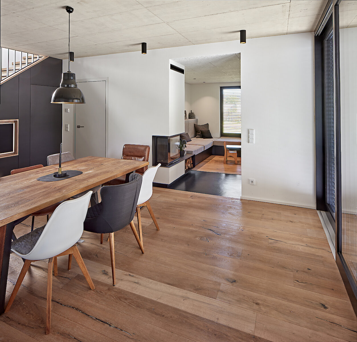 Der „Herzraum“ im Erdgeschoss ist Dreh- und Angelpunkt. Hier steht der große Esstisch, hier ist das große Fensterelement zum Garten. Die Treppe steht als Gestaltungselement im Raum, und die Feuerstelle verleiht Atmosphäre und Wärme. Küche und Wohnzimmer, beide relativ klein, sind seitlich angedockt. Flure gibt es kaum.