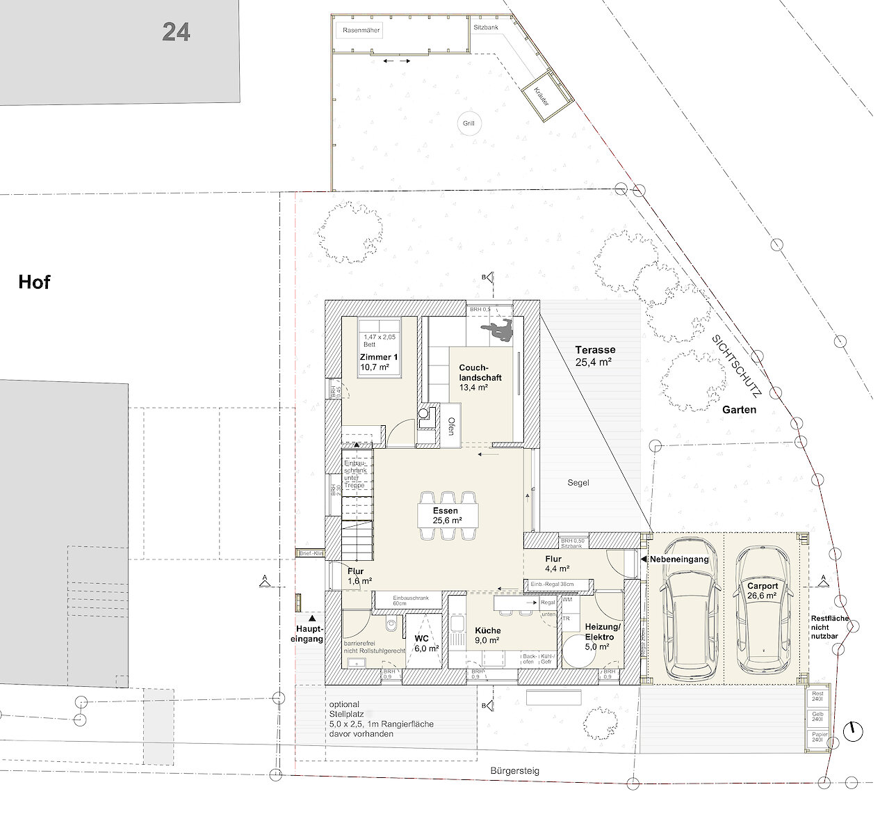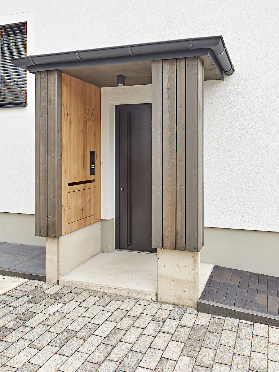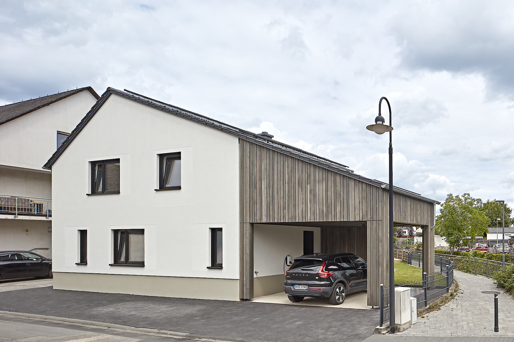 Die örtlichen Begebenheiten ergaben einen L-förmiger Grundriss; ein Carport verlängert das Haus optisch in Richtung der Brücke. Dadurch entstand zugleich eine geschützte Terrasse zum Bach. Die Holzelemente des Carports wiederholen sich im gegenüberliegenden Eingangspavillon und dem Gartenhäuschen. Dezente Putzfaschen um die Fenster herum sind ein Zitat der traditionellen Sandsteingewände der alten Häuser in der Nachbarschaft.