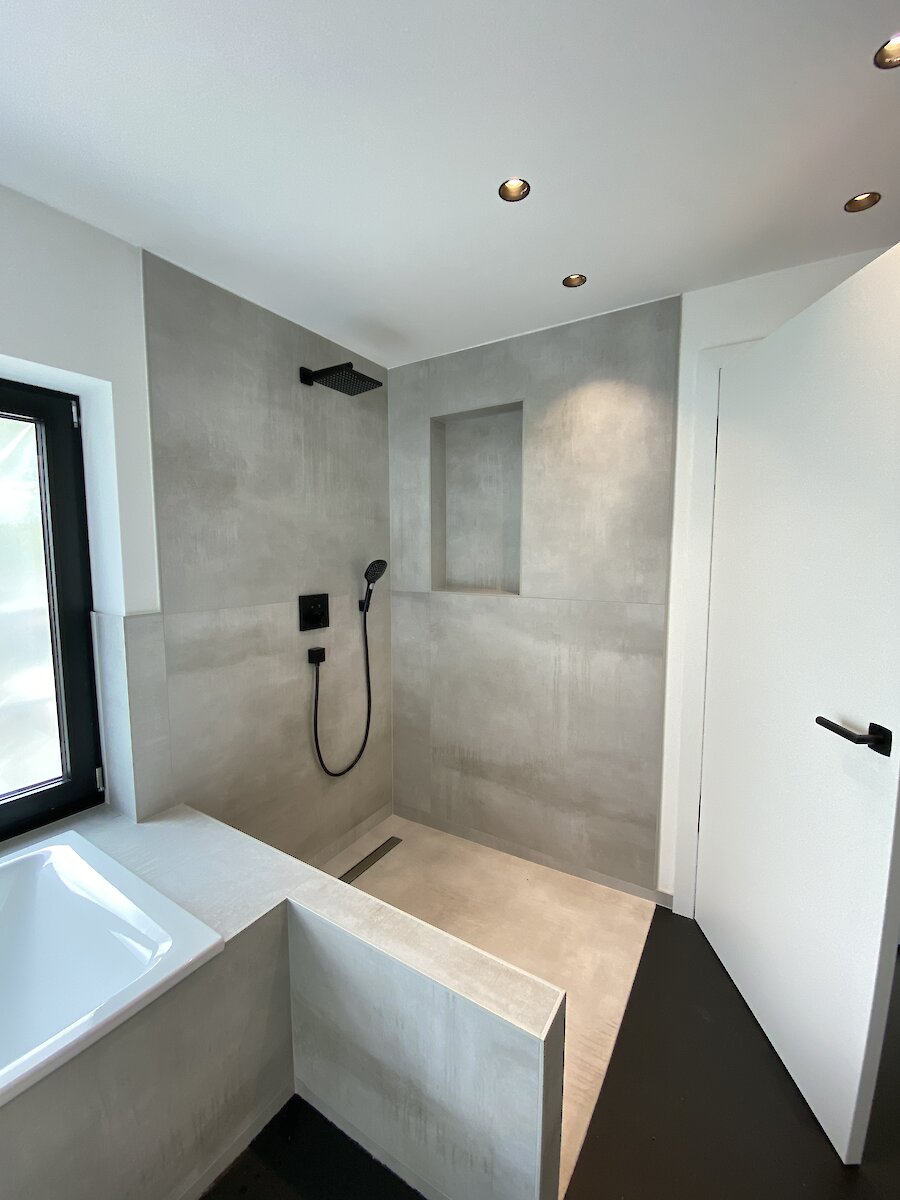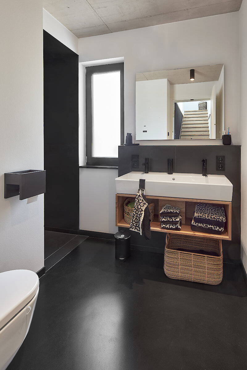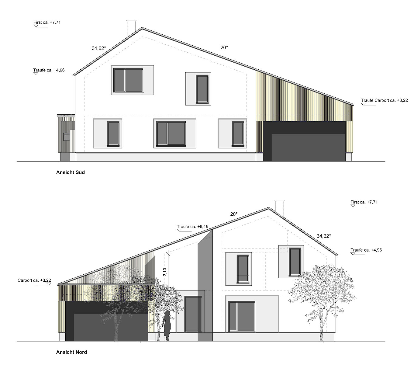 Die örtlichen Begebenheiten ergaben einen L-förmiger Grundriss; ein Carport verlängert das Haus optisch in Richtung der Brücke. Dadurch entstand zugleich eine geschützte Terrasse zum Bach. Die Holzelemente des Carports wiederholen sich im gegenüberliegenden Eingangspavillon und dem Gartenhäuschen. Dezente Putzfaschen um die Fenster herum sind ein Zitat der traditionellen Sandsteingewände der alten Häuser in der Nachbarschaft.