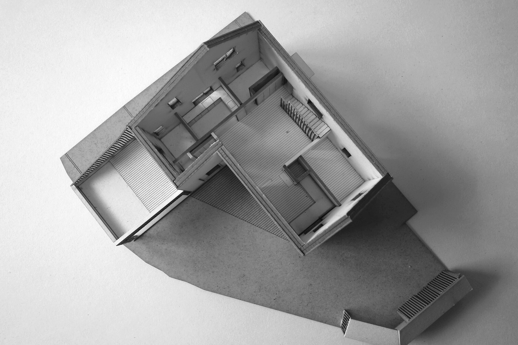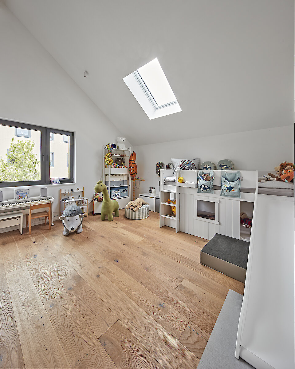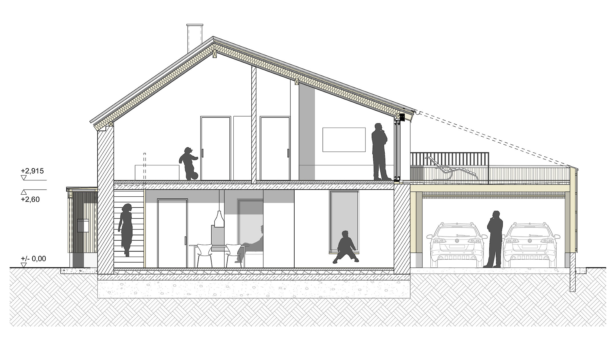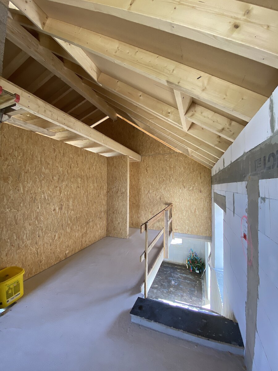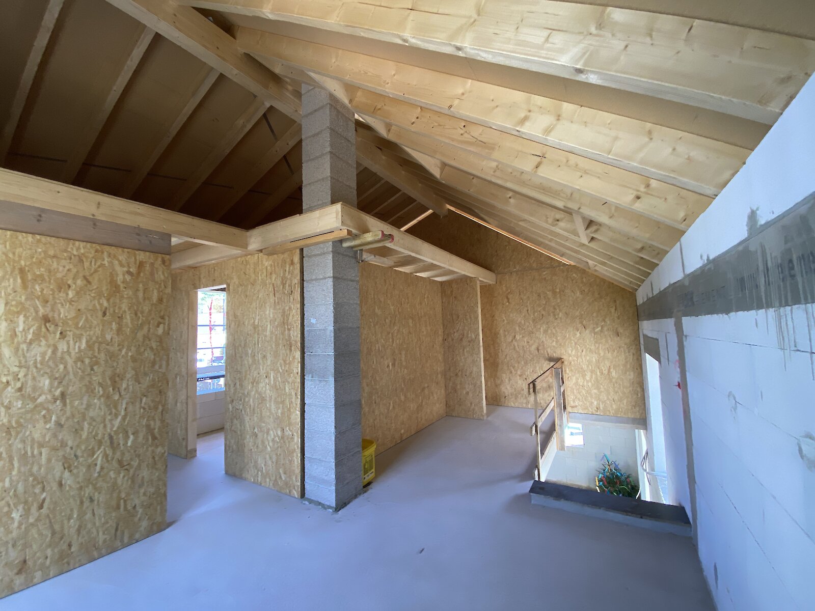 Im Obergeschoss ist der Dachraum bis unter den First offen, so dass in der Mitte der Räume eine Höhe von über 4,00 m besteht. Das verleiht den Räumen Großzügigkeit; so konnte der gesamte Baukörper im Volumen stark verkleinert werden, was den Kosten und der Proportion stark zugutekommt.