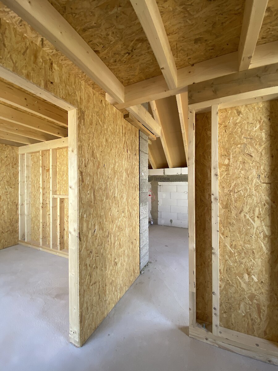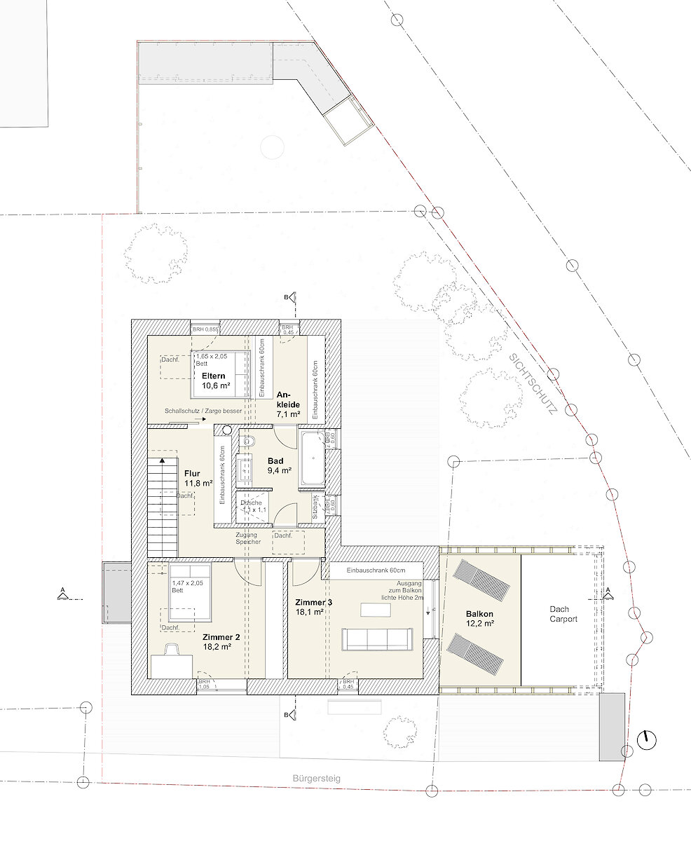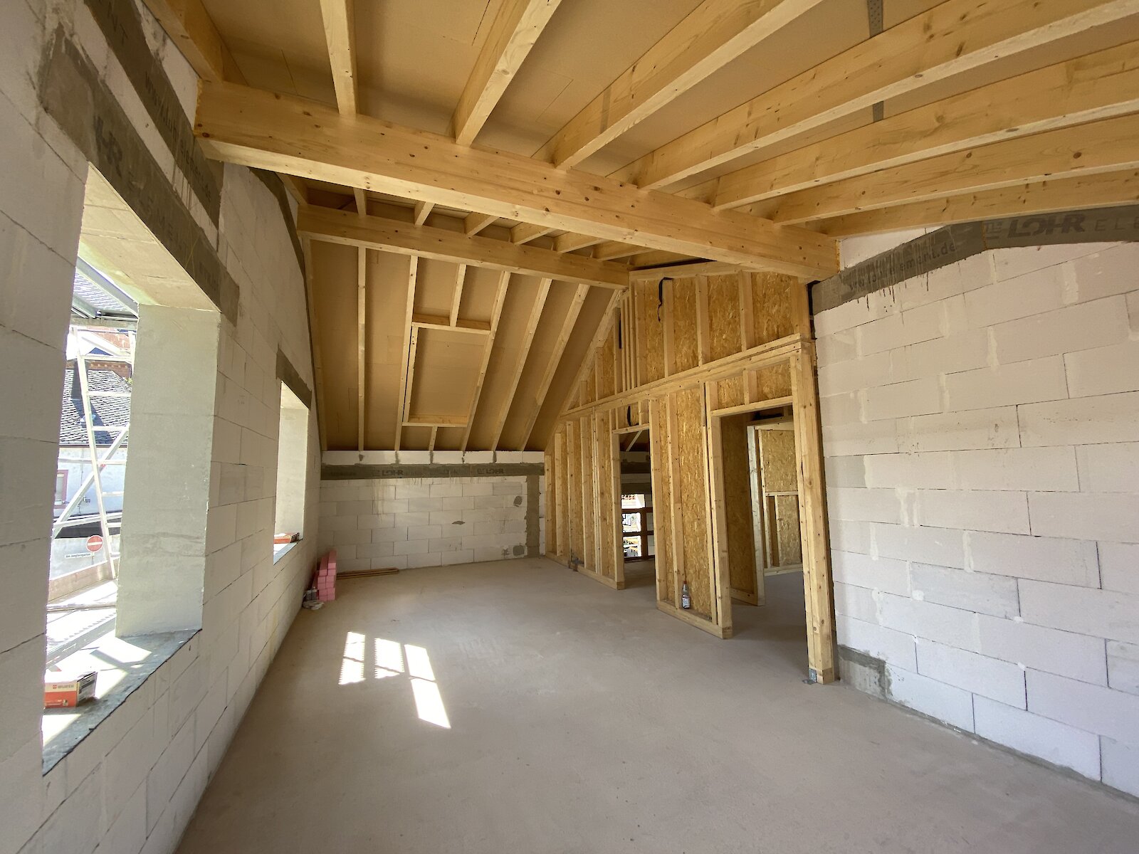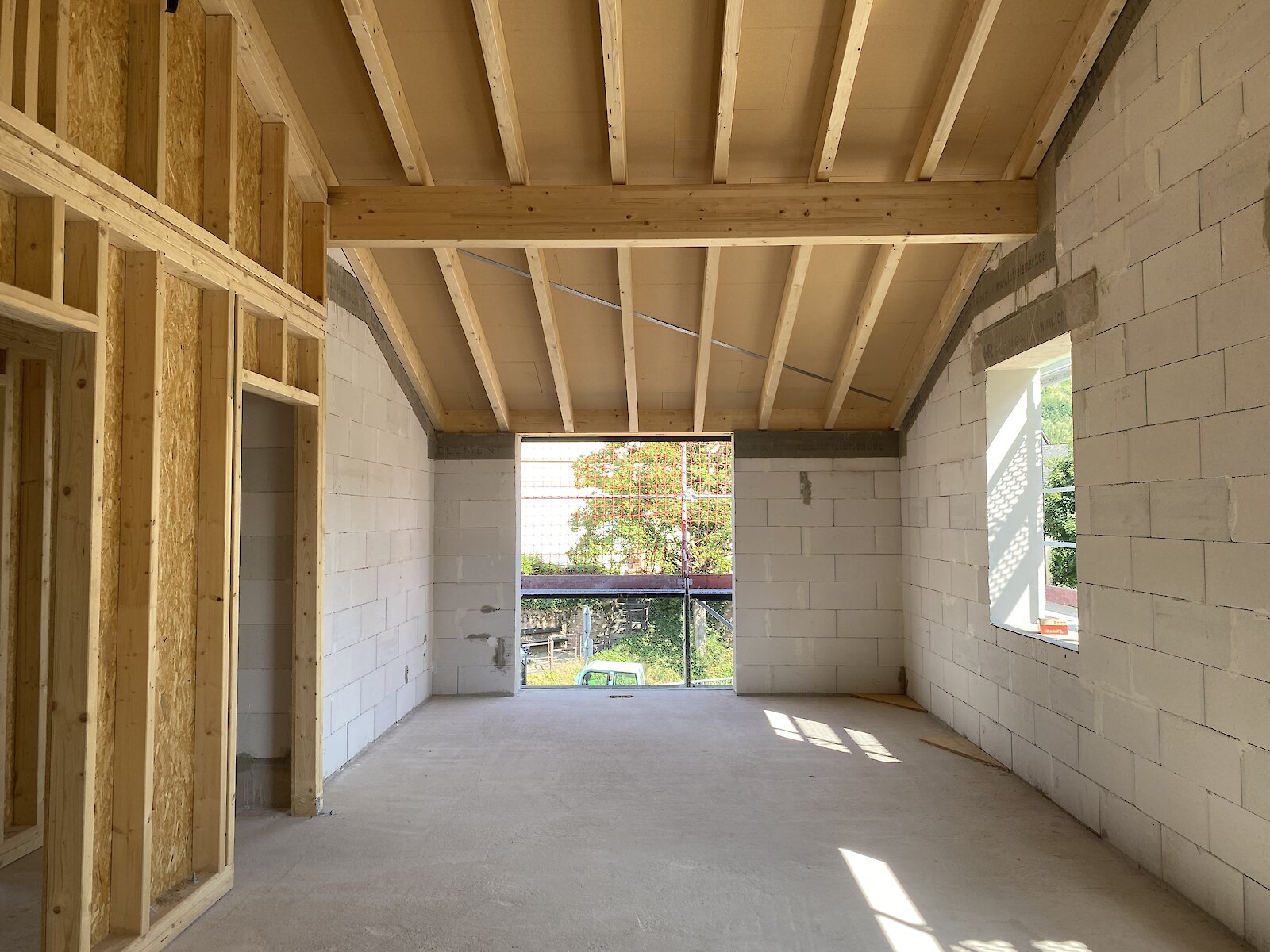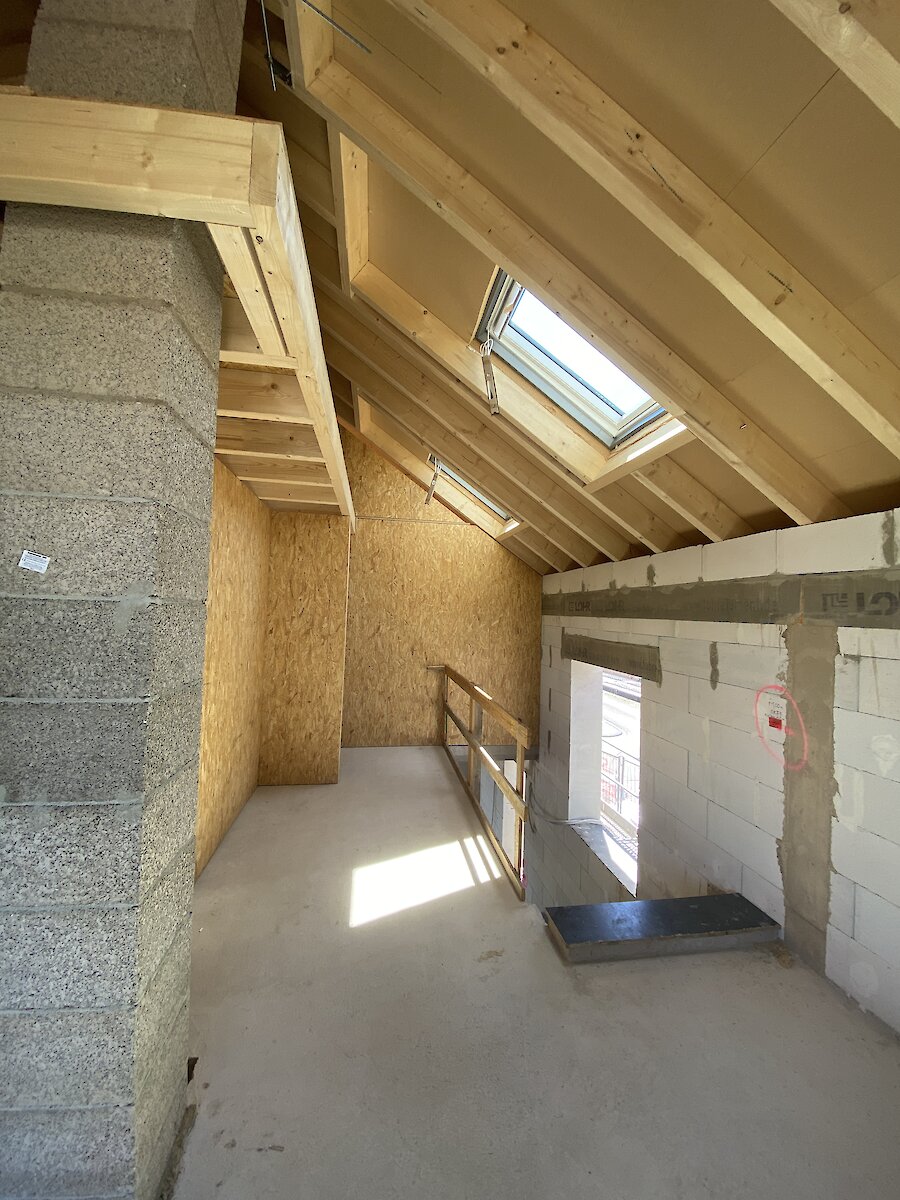 Im Obergeschoss ist der Dachraum bis unter den First offen, so dass in der Mitte der Räume eine Höhe von über 4,00 m besteht. Das verleiht den Räumen Großzügigkeit; so konnte der gesamte Baukörper im Volumen stark verkleinert werden, was den Kosten und der Proportion stark zugutekommt.