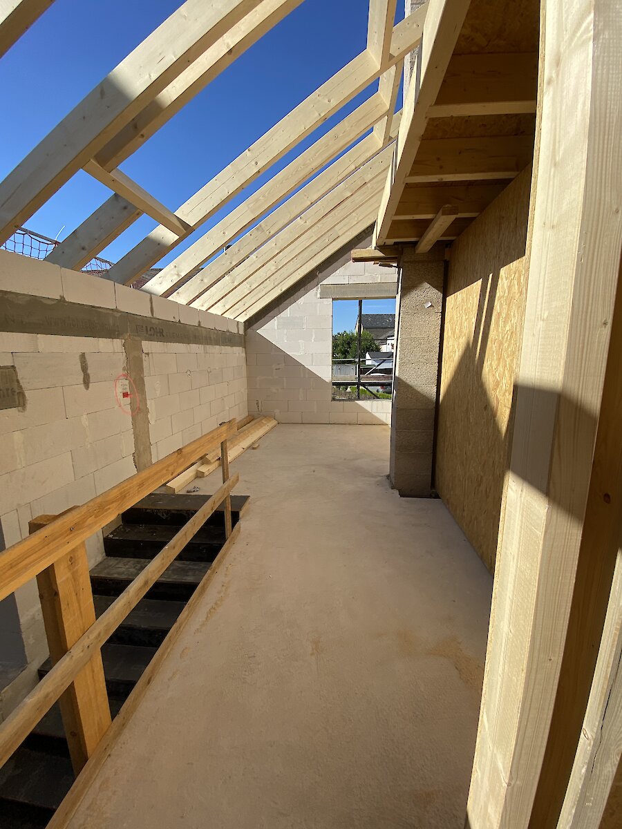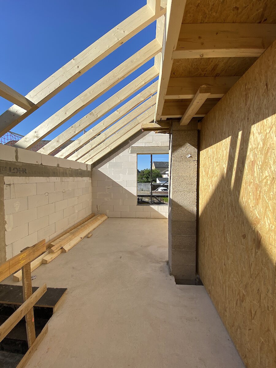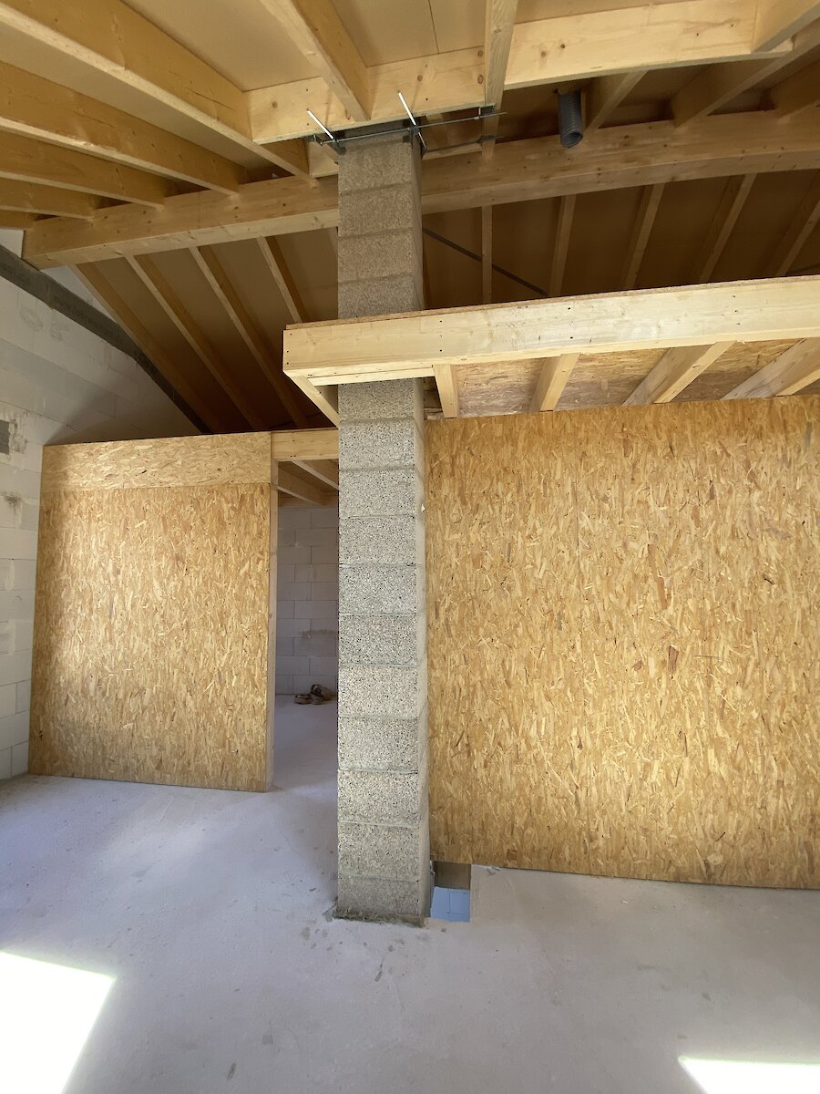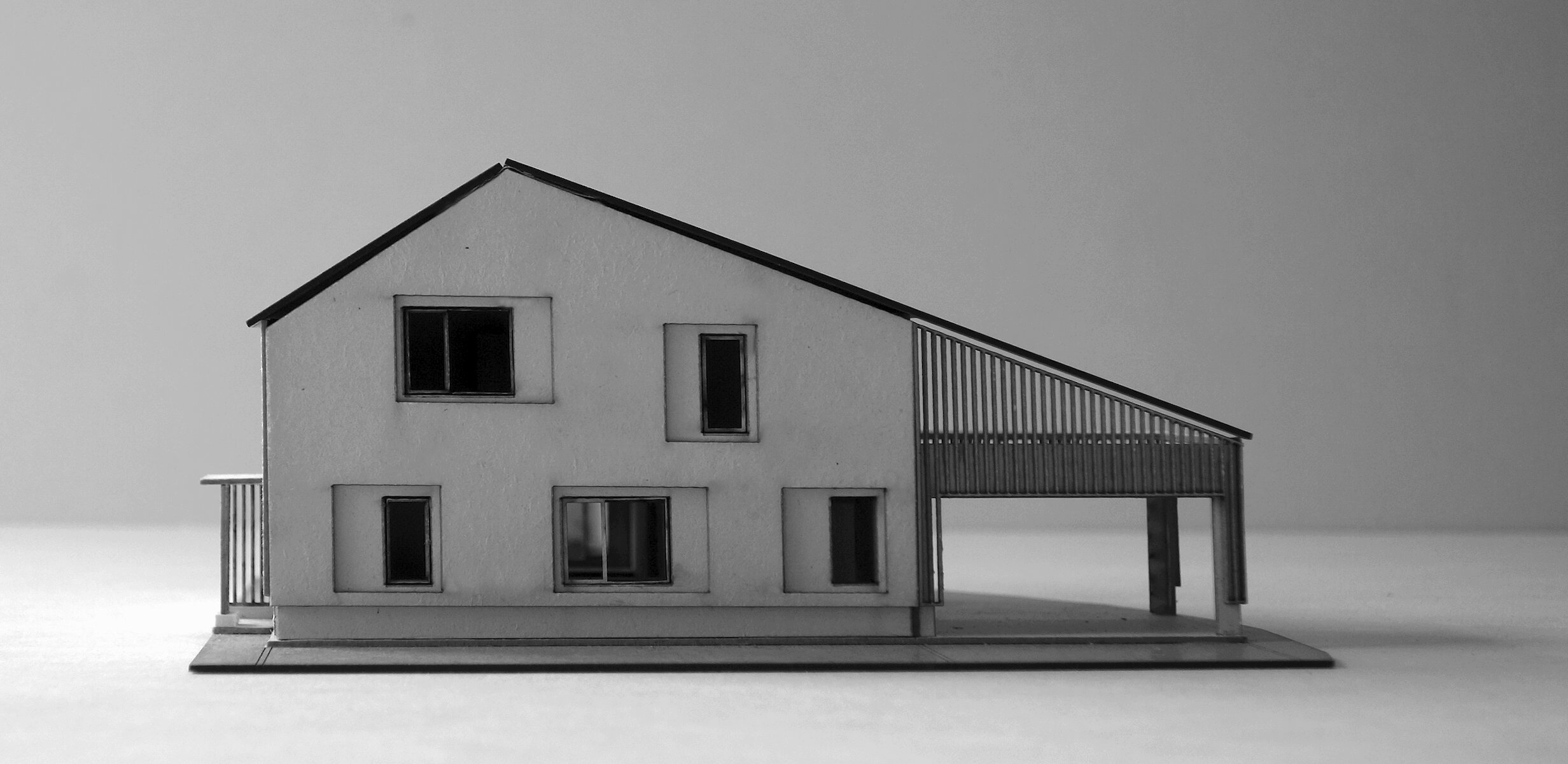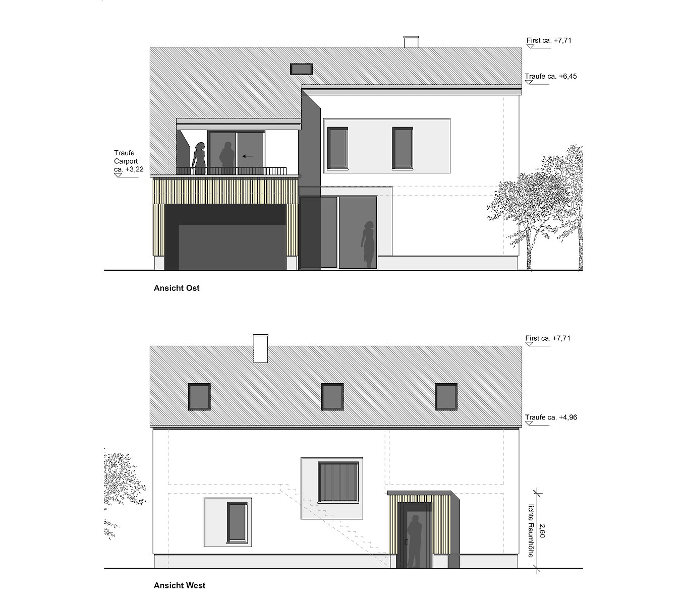 Im Obergeschoss ist der Dachraum bis unter den First offen, so dass in der Mitte der Räume eine Höhe von über 4,00 m besteht. Das verleiht den Räumen Großzügigkeit; so konnte der gesamte Baukörper im Volumen stark verkleinert werden, was den Kosten und der Proportion stark zugutekommt.